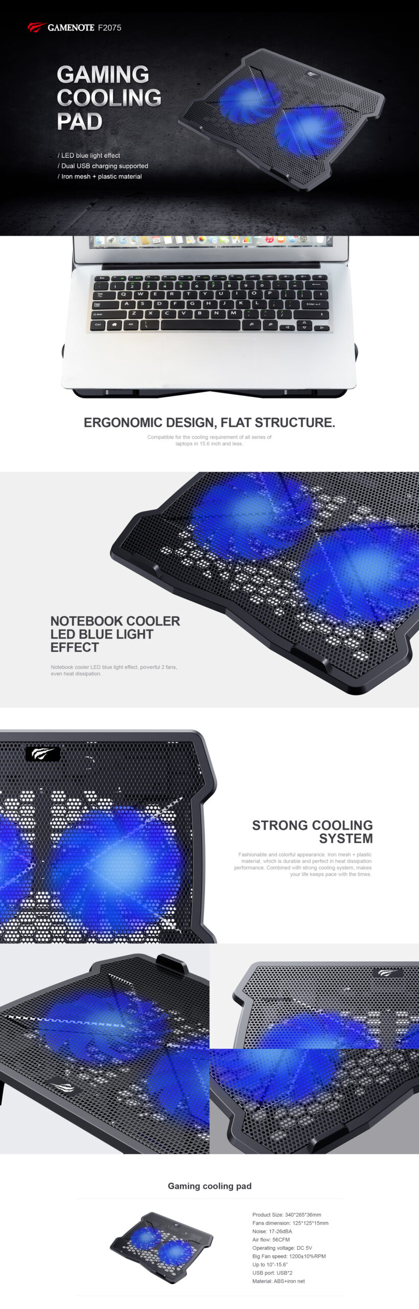 GAMENOTE F2075 Gaming Cooling Pad – Dual Fan Laptop Cooler with Blue LED