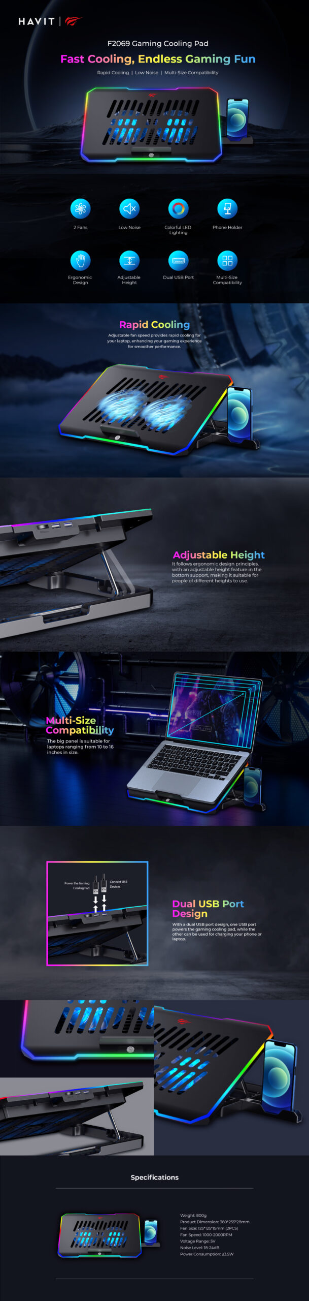 Built with a durable ventilated surface, the HAVIT F2069 improves airflow efficiency while maintaining laptop stability. The dual USB port design allows one port to power the cooling pad while keeping an extra USB port available for connecting other devices.