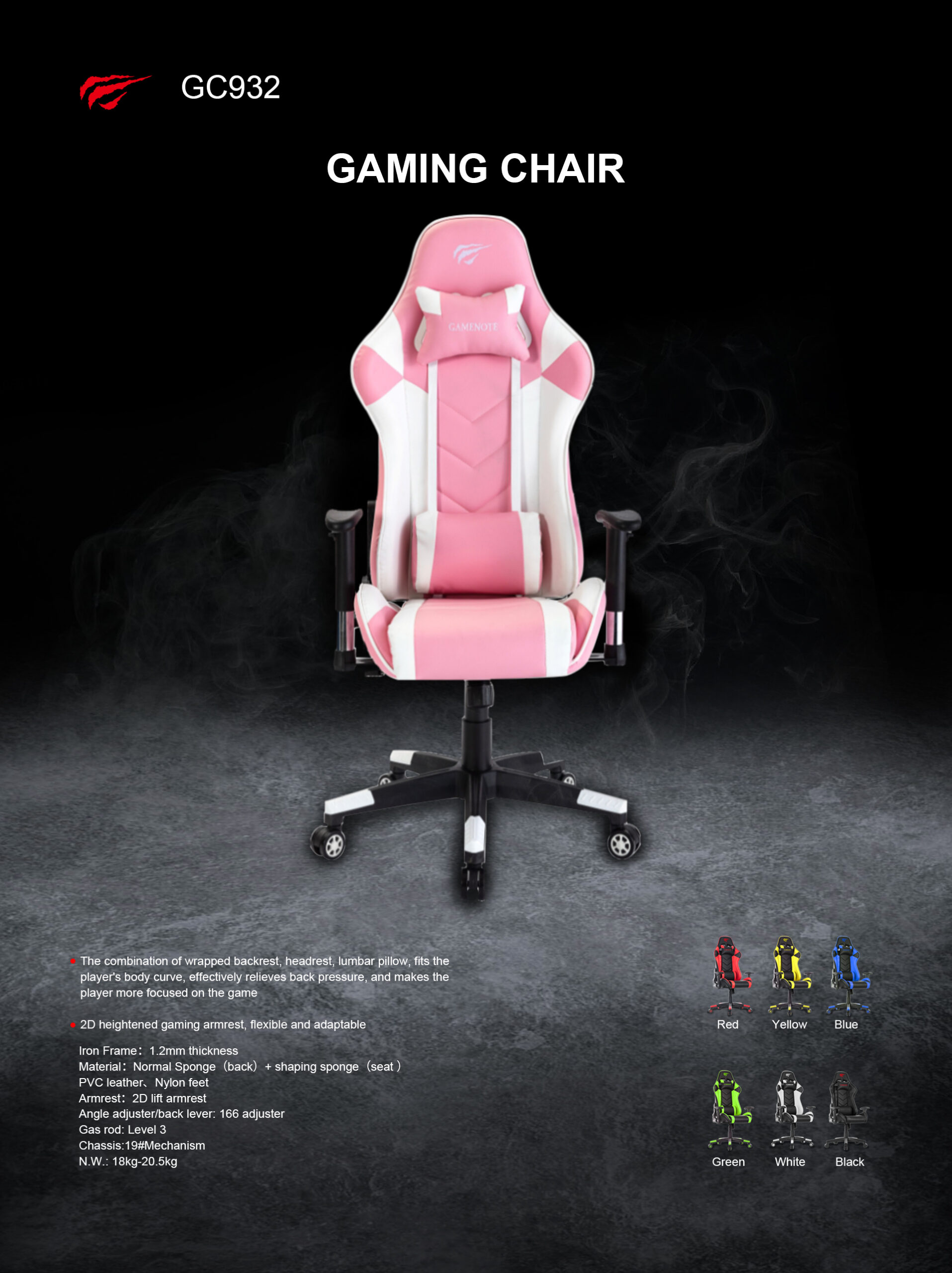 The chair features 2D height-adjustable armrests for flexible positioning and an adjustable backrest up to 166°, allowing you to relax between games. Built with a strong iron frame and high-density foam padding, the GC932 ensures durability, stability, and long-lasting comfort.