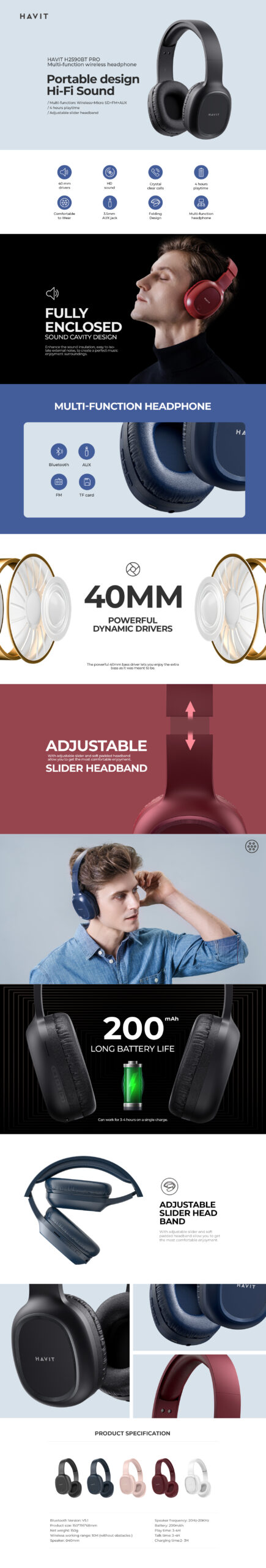 Experience premium sound and comfort with the HAVIT H2590BT PRO Multi-Function Wireless Headphones.