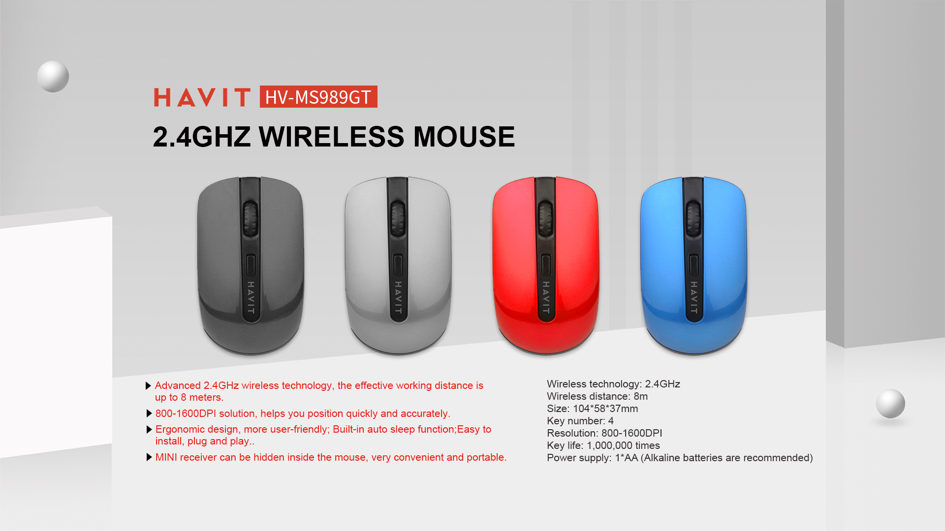 The HAVIT HV-MS989GT Wireless Mouse is a practical and lightweight 2.4GHz mouse designed for everyday use, whether you are working, studying, or traveling. With its advanced wireless technology, the HAVIT HV-MS989GT provides a stable and smooth connection with an operating distance of up to 8 meters, allowing you to use it without interference.