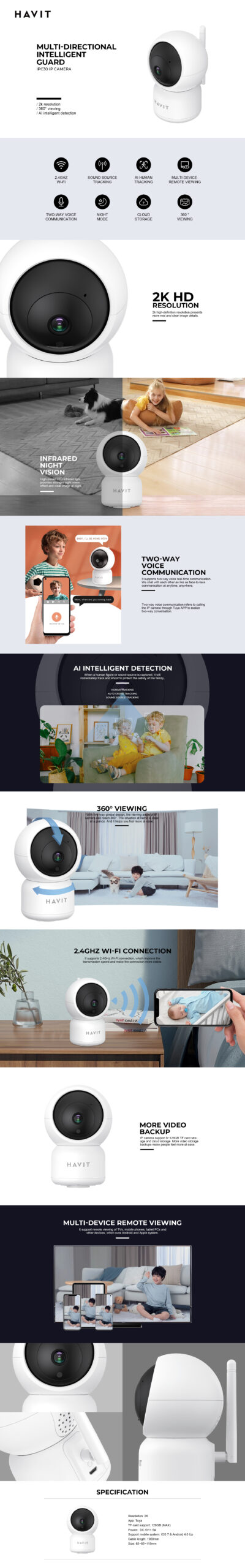 With its sleek, modern design and intelligent features, the HAVIT IPC30 Smart IP Camera is perfect for home security, baby monitoring, pet watching, and office surveillance.