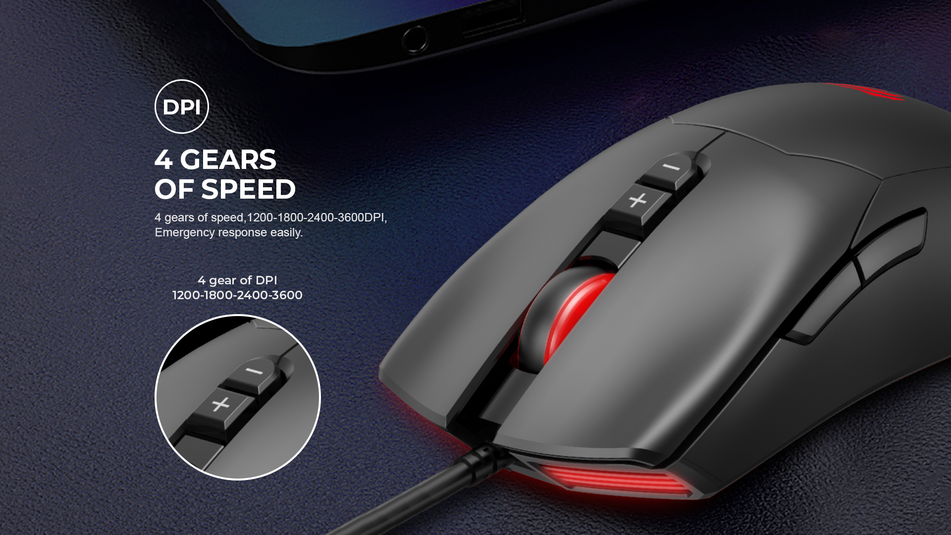 Mouse USB Interface, 7 buttons, 1200–3600 DPI, 3 million clicks, 1.5m cable