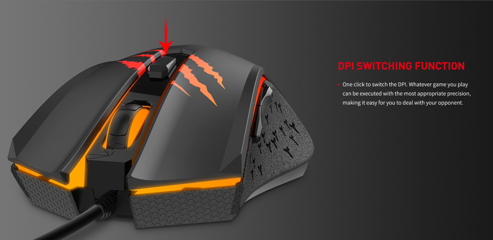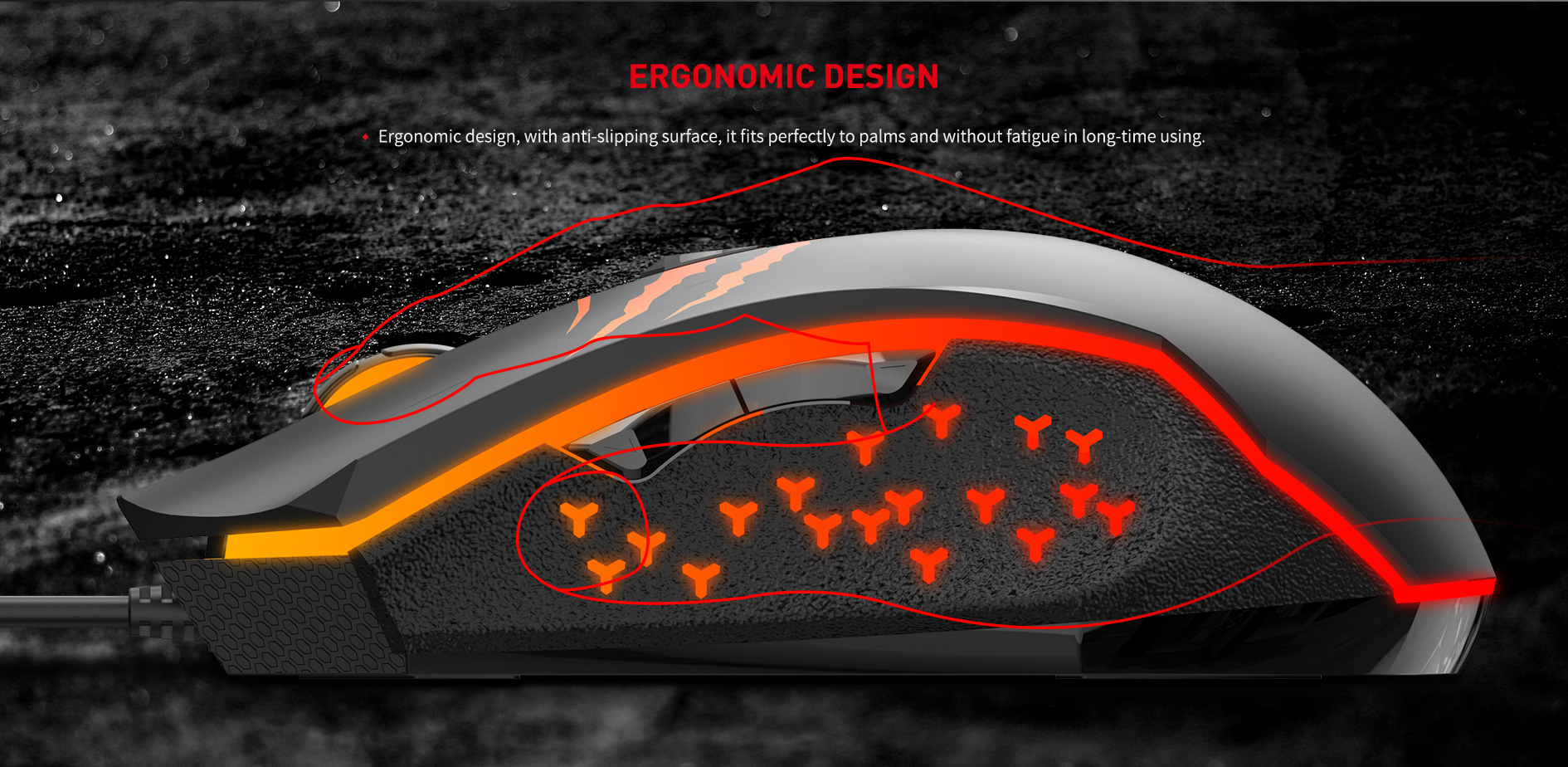Stylish orange lighting details add a dynamic gaming atmosphere, making the mouse look powerful and modern on any setup. Its plug-and-play USB connection ensures instant compatibility without needing drivers.