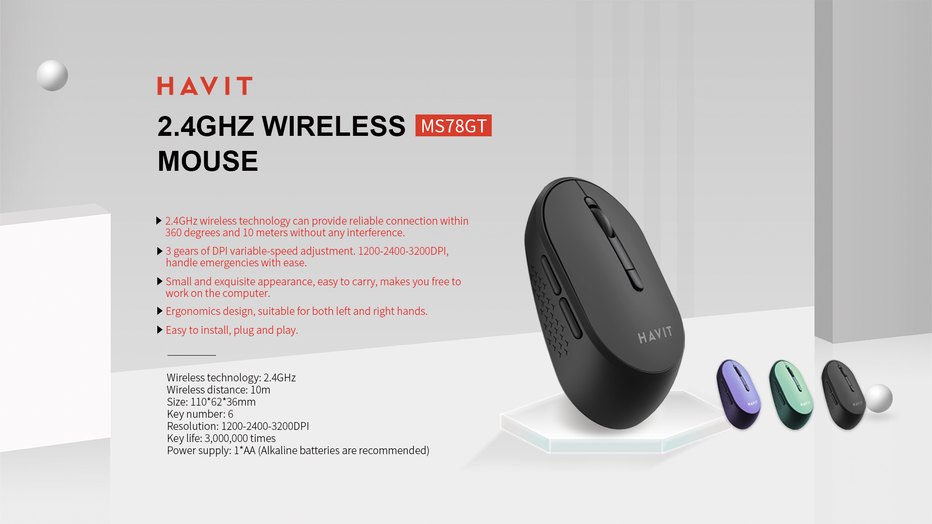 The HAVIT MS78GT Wireless Mouse is designed to deliver smooth, reliable, and comfortable performance for daily work, study, and travel. With advanced 2.4GHz wireless technology, the HAVIT MS78GT provides a stable and interference-free connection with an operating distance of up to 10 meters, giving you full freedom of movement.