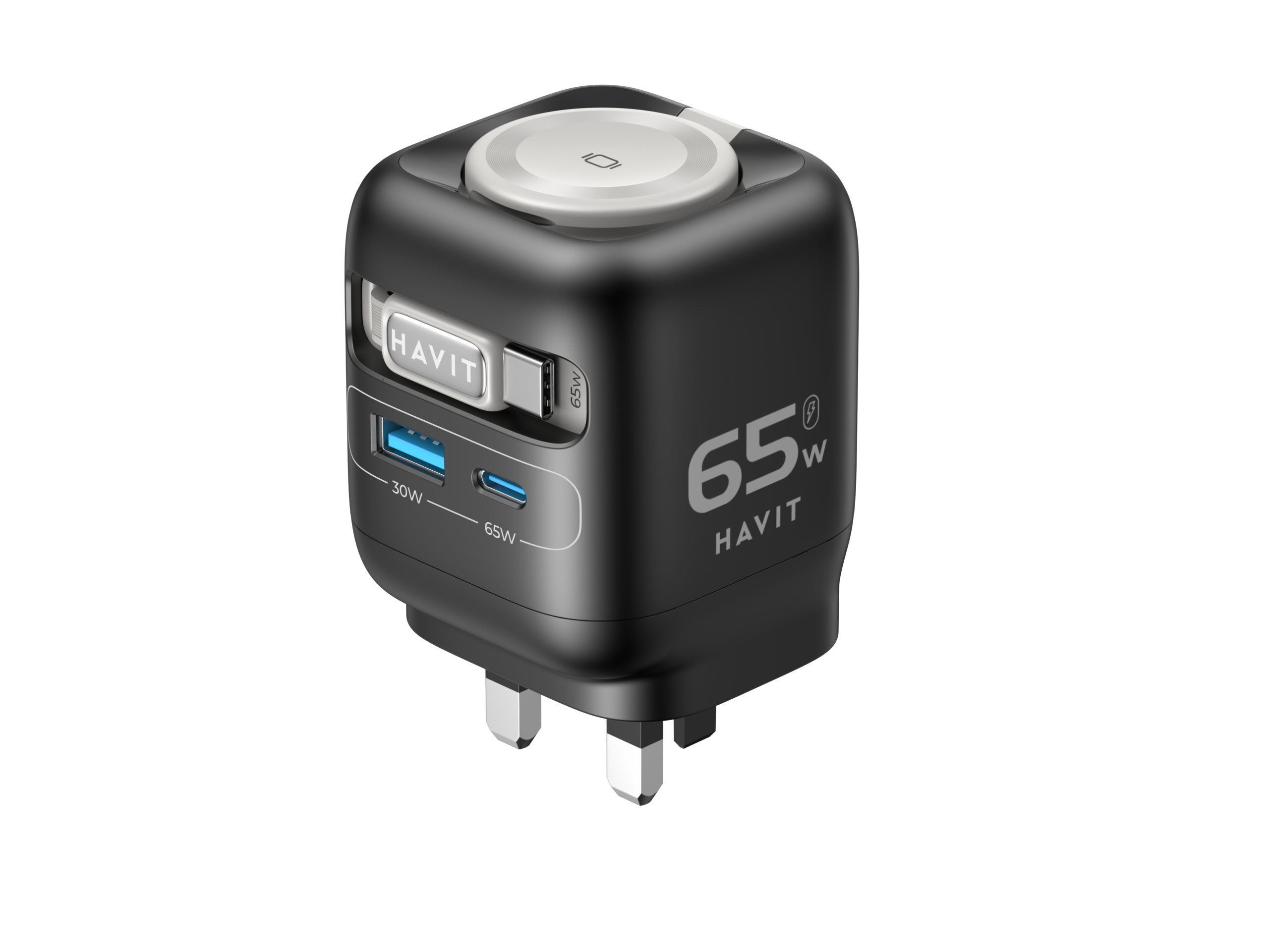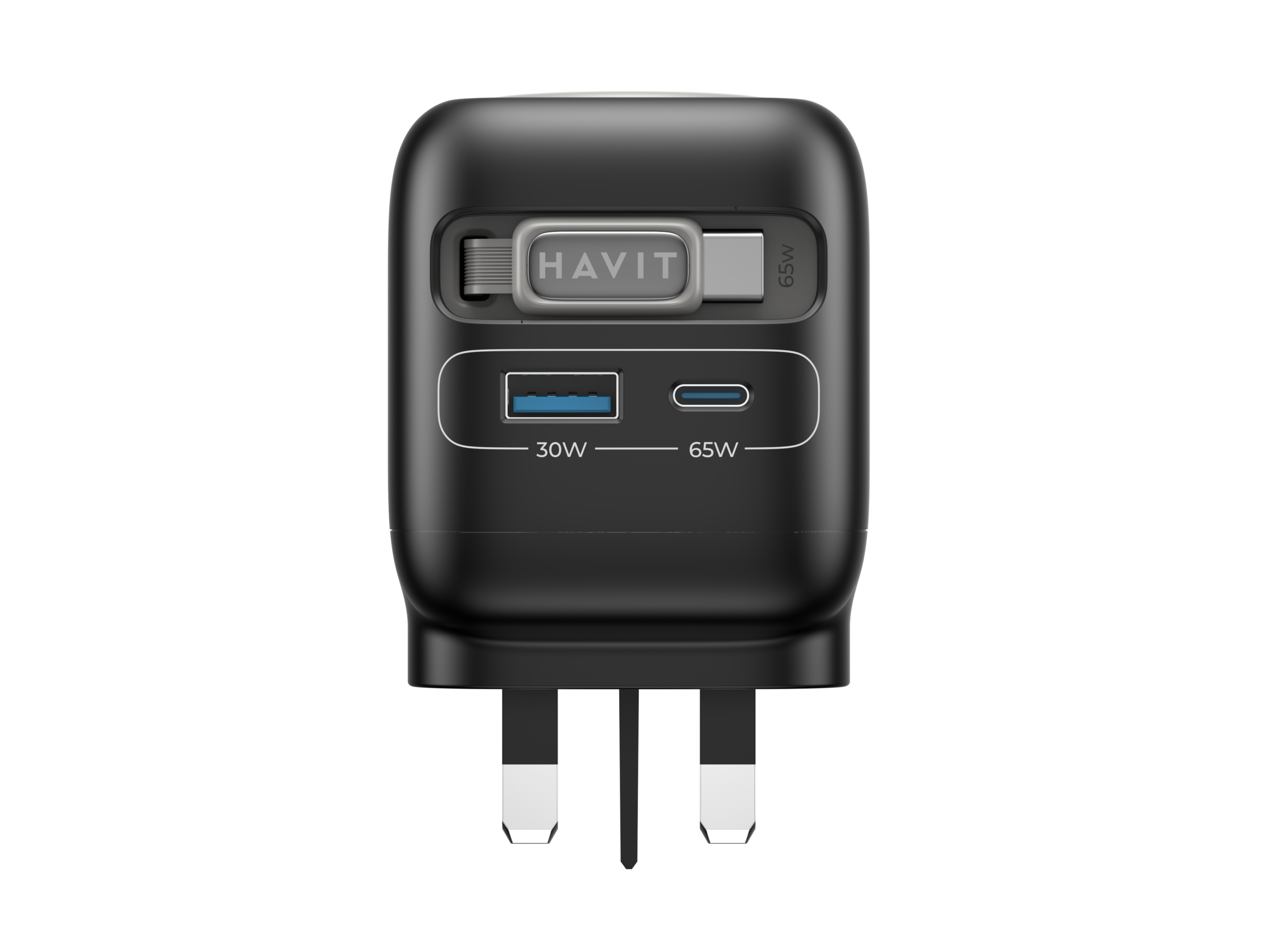 HAVIT UC252 65W Fast Charger – USB-C & USB-A GaN Charger with Built-in Cable