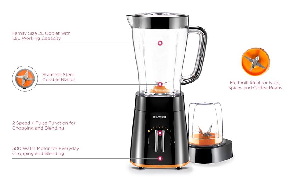 - In addition, the kenwood blender blp15.150bk comes with a mill for nuts, spices, coffee beans and herbs. As well as being a powerful staple for your kitchen, the kenwood blender has a high gloss finish for durability as well as style