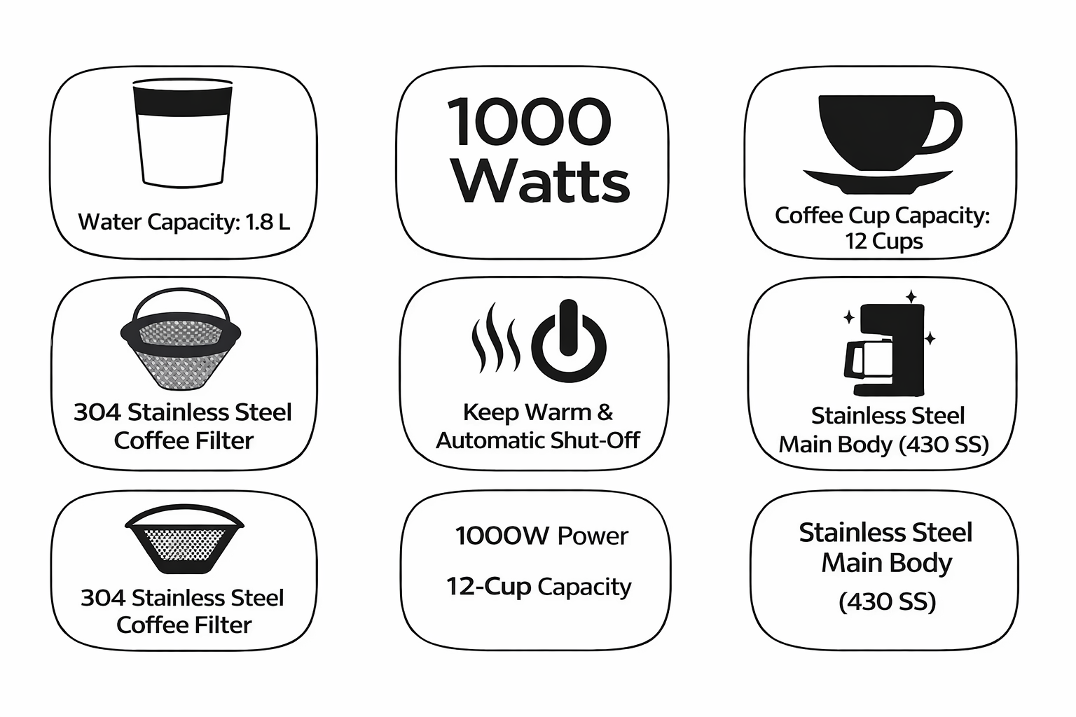 The built-in keep-warm function maintains your coffee at the perfect temperature after brewing, while the automatic shut-off feature enhances safety and energy efficiency. Crafted with a stainless steel body, the machine offers durability and a sleek, modern design that fits seamlessly into any kitchen.