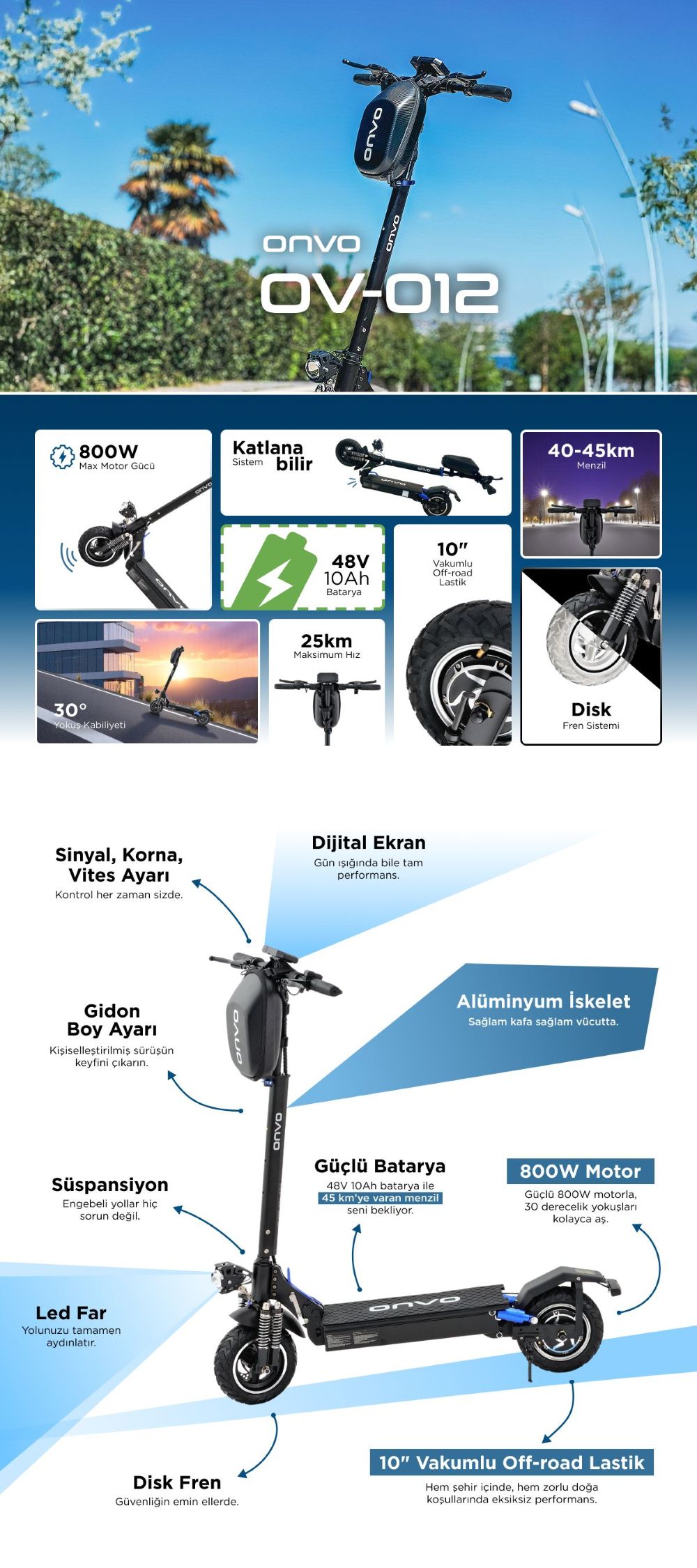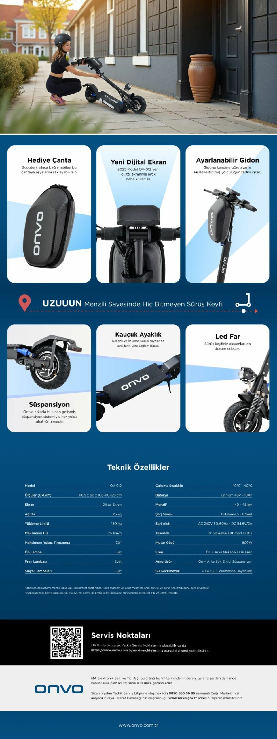With a strong aluminum frame, IPX4 water resistance, and a maximum load capacity of 150 kg, the ONVO OV-012 is a reliable and versatile electric scooter for daily commuting, outdoor adventures, and long-distance city rides.