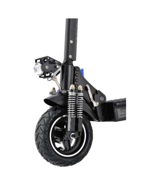 Designed for comfort and safety, the scooter features front and rear suspension, LED headlight, mechanical disc brakes, and 10-inch vacuum off-road tires that deliver superior grip and stability on various surfaces.